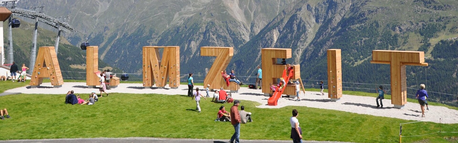Neben den großflächigen Infotafeln bei der Mittelstation der Gaislachkoglbahn steht der rund drei Meter hohe „ALMZEIT“-Schriftzug. Dieser ist mit einer Rutsche, Klettermöglichkeiten und Liegen ausgestattet.