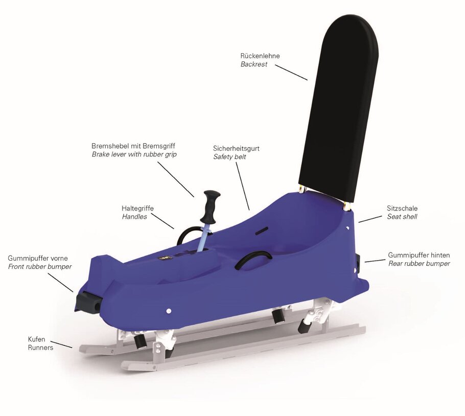 Auf einem hochwertigen Aluminium-Chassis ist die individualisierbare Sitzeinheit des Mountain Coasters installiert. Diese bietet Platz für einen Erwachsenen sowie zusätzlich ein Kind unter 8 Jahren. Sowohl für den Fahrer als auch das Kind sind separate Sicherheitsgurte vorhanden, die das Herausfallen aus der Rodel verhindern. Wahlweiße kann auch eine Rückenlehne und ein Regenschutz geordert werden die den Fahrkomfort erhöhen. Zusätzlich sind an der Vorder- und Rückseite energieabsorbierende Gummipuffer angebracht, die bei einem Zusammenstoß einen Teil der Energie absorbieren.