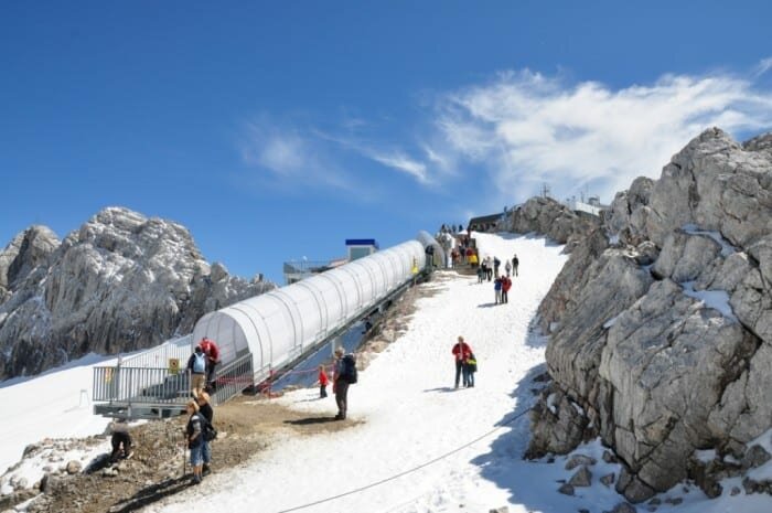 Ein neues Förderband am Dachstein befördert die Gäste bequem vom Gletscherfeld hinauf zur Bergstation der Südwandbahn