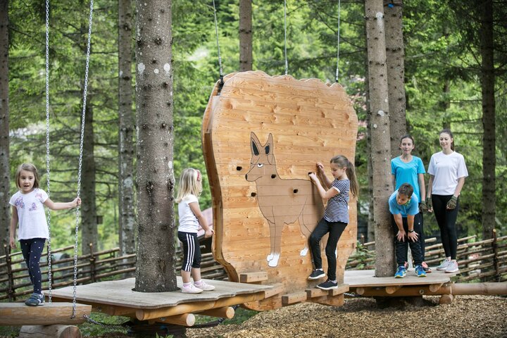 Mit dem Motto „Schnell, aktiv und voller Leben ist der Fuchs und so bist du“ steht dabei der schlaue und flinke Fuchs im Wald im Mittelpunkt. Die Kinder können somit den Lebensraum Wald erleben und besser kennenlernen. Unterschiedlichste Geräte und Stationen in verschiedenen Höhen laden zum Ausloten eigenen motorischen Fähigkeiten ein. Dabei geht es vor allem um die Geschicklichkeit und ein feinfühliges Gleichgewicht. Spielerisch können sich die Kids an ihre Grenzen herantasten. Gegen Ende warten noch zwei Türme auf die jungen Gäste, die mit einem Gittertunnel verbunden sind. Der Miniklettergarten wird mit einer rasanten Rutsche abgeschlossen.