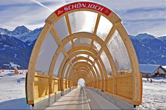 Die Hauptverbindung von der Kinderschneealm zur Gondelbahn und dem Restaurant stellt ein 70 Meter langer Zauberteppich von Sunkid dar. Diese Anlage kann die Gäste sowohl talwärts als auch bergwärts befördern (also in beide Richtungen). Sunkid wurde vom Kunden vor die Aufgabe gestellt, diese Hauptader, die ganzjährig benutzt wird, mit einer Überdachung auszustatten, die sich optisch in das Gesamtkonzept der neuen Kinderschneealm einfügt. So entwickelte Sunkid gemeinsam mit seinem Partner Almholz eine Holzgalerie, die einem Tiroler Stall nachempfunden ist. Besondere Herausforderung dabei waren zwei Seilbahnen, die knapp über der Galerie queren. In enger Zusammenarbeit mit der Tiroler Landesregierung wurde ein entsprechendes Sicherheitskonzept erarbeitet. Förderband und Holzgalerie wurden anstandslos Anfang Dezember behördlich genehmigt. Somit laufen seit heuer in Serfaus 14 Sunkid Förderbänder, davon die Hälfte mit Überdachung.