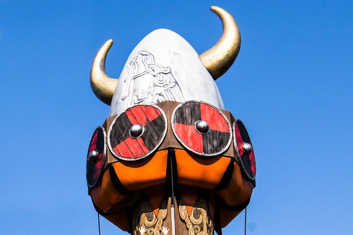 Mächtige Wikingerhelme auf der Spitze der beiden Sunkid Tower sind das Wahrzeichen des Wikingerlandes im größten Freizeitpark Skandinaviens