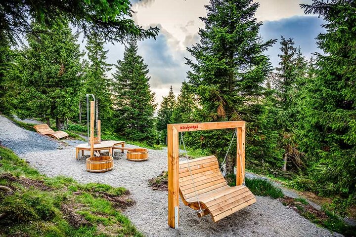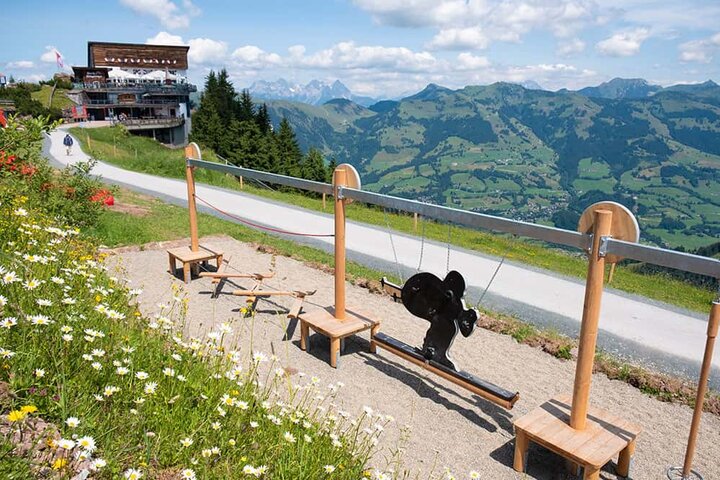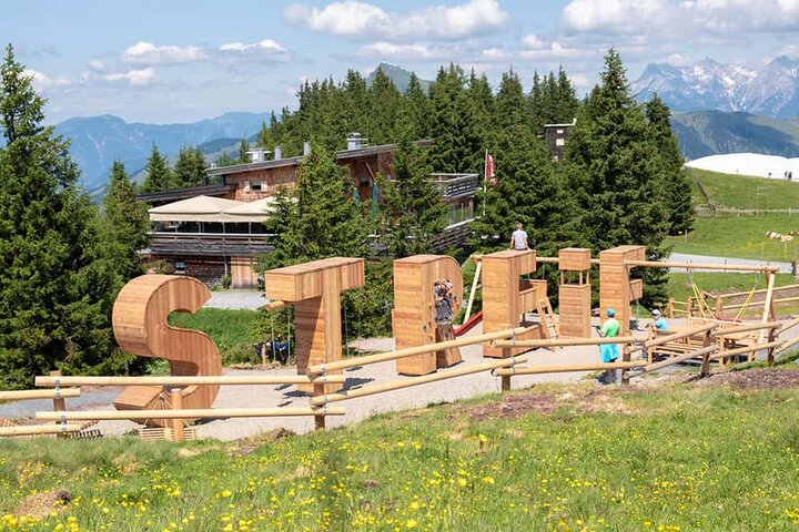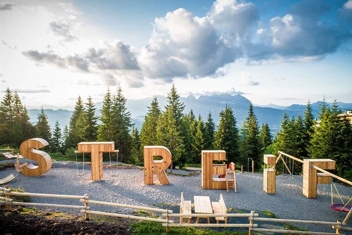 Auch wenn der Start des Streif Erlebnisweges nicht ganz so rasant ist, braucht es schon ein kleines bisschen Mut, um sich aus dem original Starthaus auf die Hangrutsche zu wagen. Kaum ist der Starthang gemeistert geht es auch schon weiter zur nächsten Schlüsselstelle. Der berühmt berüchtigten Mausefalle. Weiter geht es in den technisch anspruchsvollen 180° Rechtsschwung, hinein ins Karussell. Ausfahrt Steilhang und der Brückenschuss sind ebenso mit von der Partie wie der Seidalmsprung, der gleichzeitig das zentrale Element des Streif Erlebnisweges bildet. Dabei fällt dem Besucher sofort der auffällige, 3 Meter hohe Streifschriftzug, ins Auge der nicht nur ein einmaliges Fotomotiv, sondern zugleich auch Spielplatz für Kinder ist. Bänke und Sonnenliegen aus Lärche laden gleichermaßen zum Entspannen und Genießen ein, während die Jüngsten sich am Abenteuerspielplatz vergnügen.