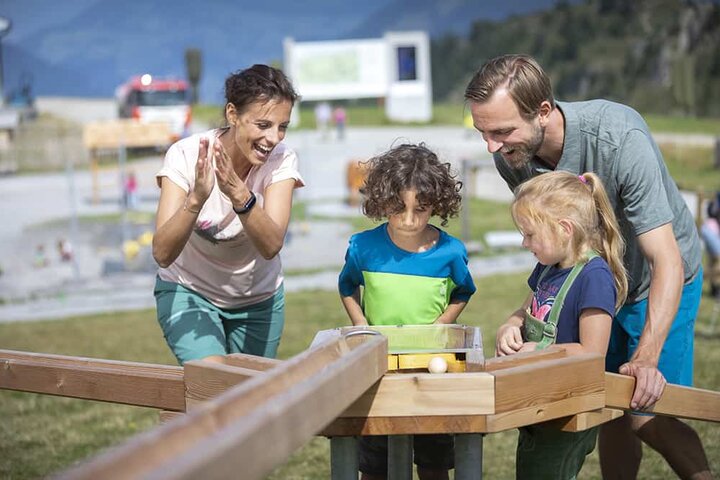Bewegen wir uns nun vom Hochjoch nach Süden in den Ort Gaschurn. Von dort aus genießen wir den schönen Ausblick während der ca. 10-minütigen Fahrt mit der Versettla Bahn zur Bergstation. Oben angekommen, bietet die Alpenwelt Nova eine lehrreiche Erlebniswelt. Anders als im eigenen Garten sieht die Flora am Berg aus und auch über die Tiere kann so einiges gelernt werden. Mittels der Holzkugelbahn von Sunkid, die ganz dem Schaf gewidmet wurde, erfährt man spielerisch was aus der Wolle der Montafoner Steinschafe hergestellt wird. Neben dem lehrreichen Aspekt bietet die Kugelbahn Familien und Kindern vor allem eines: Spaß! Ganz nebenbei sind die mit dem Logo der Destination gebrandeten Kugeln auch eine hervorragende Erinnerung an die schönen Urlaubstage, die Zuhause zum Wiederkommen einladen. Genau diese Kugeln sind es, durch deren Verkauf sich die Investition schon binnen kurzer Zeit auch betriebswirtschaftlich mehr als ausgezahlt hat. Neben der Holzkugelbahn informiert auch der neue Themenweg Vier Barga in einzelnen Staionen (Hütten) über das Leben am Berg.