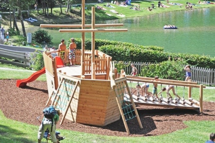 Am Beispiel des Freizeitgeländes in Ried knüpft sich die Thematisierung zweier Spielgeräte an den in unmittelbarer Nähe gelegenen Badesee. Zum einen das Spielschiff, das viele Spielgeräte kombiniert und ohne zu vergrabende Fundamente auskommt. Ob als verwegener Schiffsführer von Piraten, als Pionier eines Expeditionsschiffes oder auch ganz gediegen als Kapitän des Traumschiffes - das Schiff bietet den Kindern für ihr fantasievolles Spiel einen bestens geeigneten Rahmen. Auch das Abenteuerbaumhaus ist ein spektakulärer Anziehungspunkt für Kinder: Die ausgefallene Gestaltung regt die Fantasie der spielenden Kinder an. Ist es vielleicht gar ein Piratenversteck, in dem die eroberten Schätze gehortet werden? Ergänzt wird das Angebot durch den in luftige Höhe reichenden Adlerhost sowie die mächtige Goliathschaukel.