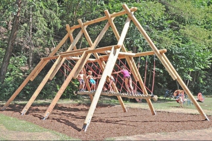 Der zentrale Baustoff Holz zeichnet sich nicht nur durch seine optimalen Eigenschaften für den Einsatz auf Spielplätzen aus, sondern bewirkt zudem, dass sich die Geräte unauffällig in die Landschaft integrieren.