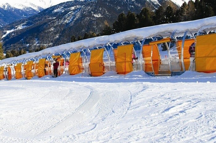 Damit den Gästen auch der entsprechende Komfort beim Aufstieg geboten wird, entschlossen sich die Betreiber des Mountain Ski Resort in Stratton zusätzlich für die Sunkid Galerie Förderbandüberdachung. Neben dem Schutz der Passagiere vor Wind, Schnee und Kälte sorgt die Sunkid Galerie auch für einen geringeren Wartungsaufwand des Betreibers. Alle 1,8m befinden sich seitliche Not-Ausgänge die für ausreichend Sicherheit garantieren. Durch die bewährte Modulbauweise der Sunkid Produkte ist auch eine Anpassung an konvex-konkaven Geländeverlauf jederzeit möglich. Die farblich hervorgehobenen seitlichen Abdeckplanen machen die Sunkid Galerie zu einem wahren Blickfang und optisches Highlight in Stratton.