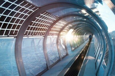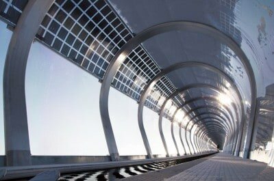 Die Produktion der Solarmodule erfolgt durch die Firma PVT Austria in Österreich. Somit ist das komplette Know-how inklusive der Hardware fast zur Gänze „Made in Austria“. Das bedeutet für den Kunden die Gewissheit von hoher Kompetenz und Qualität. Die Solarmodule werden in Sandwichbauweise mit zwei jeweils zwei Millimeter starken Polycarbonatscheiben in die Galerie einlaminiert. Dies ergibt eine sehr hohe Funktionssicherheit und einen optimalen Schutz bzw. wenig Angriffsfläche für Wind und Schnee. Zudem ermöglicht die gebogene Bauweise eine Anpassung der Zellausrichtung an den wechselnden Sonnenstand im Laufe eines Jahres. Durch das glasklare Trägermaterial ist die Sicht nach außen während des Beförderungsvorgangs möglich, was ein angenehmes Raumgefühl ergibt. Gleichzeitig bietet sich dem Bedienungspersonal eine einwandfreie Einsicht in das Förderband – ein Pluspunkt für die Sicherheit in der Galerie.