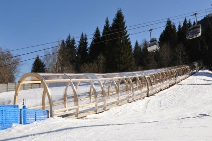 Die Holzgalerie VARIOS wurde erst letztes Jahr auf der INTERALPIN in Innsbruck dem breiten Publikum vorgestellt. Und bereits heuer war diese Galerie Teil eines der größten umgesetzten Projekte in der 15-jährigen Firmengeschichte von Sunkid. Seit Beginn der laufenden Wintersaison bildet diese Holzgalerie nämlich die Überdachung für zwei Zauberteppiche mit einer Gesamtlänge von 361 Metern, welche eine perfekte Erschließung des Übungsgelände im Talstationsbereich ermöglichen.