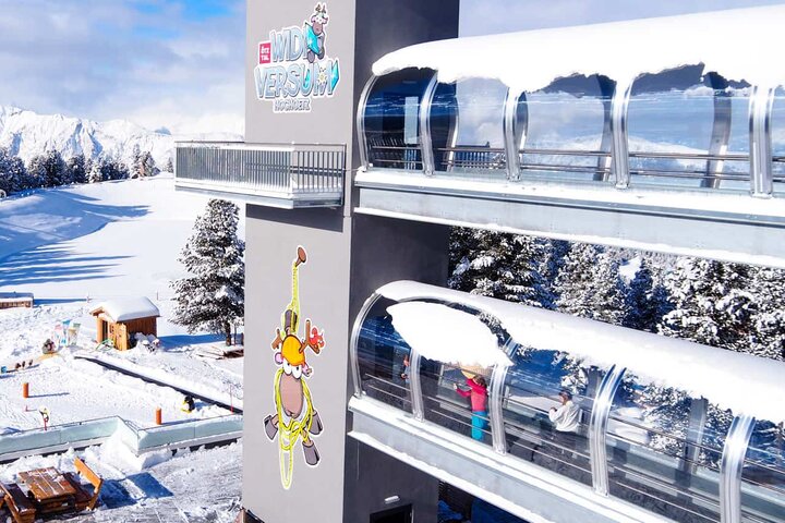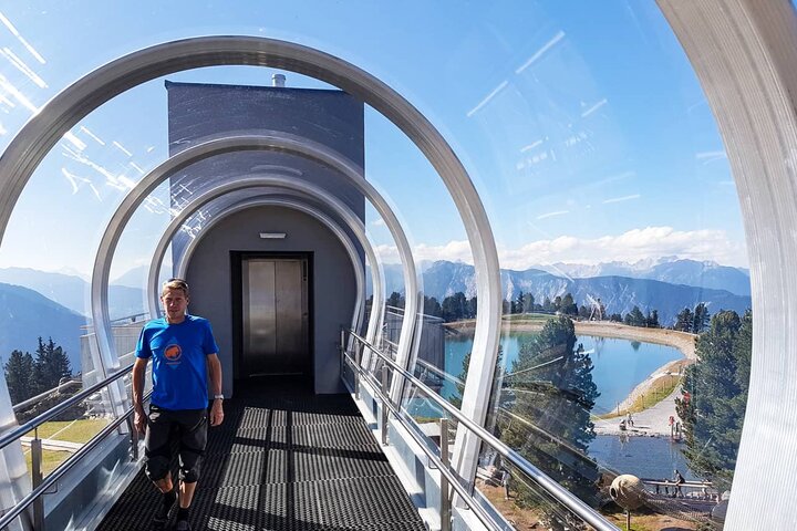 Hochoetz (AUT): Um barrierefrei von der Aussichtsterrasse des Panoramarestaurants ins WIDIVERSUM kommen zu können, wurde ein Zubau mit Lift errichtet. Um diesen vor Wind und Wetter geschützt erreichen zu können, installierte Sunkid die Galerie SOLUX über zwei Etagen.