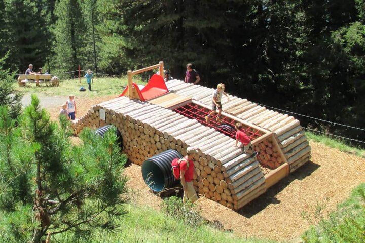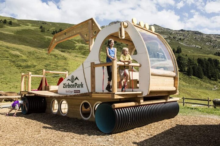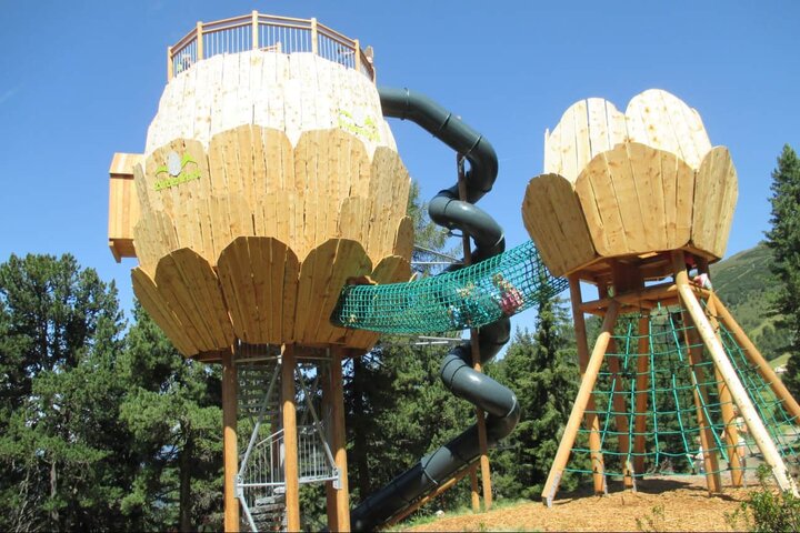 Das Highlight im ZirbenPark ist aber zweifelsohne der Zirbenzapfen-Erlebnisturm. Der 12 m hohe Erlebnisturm ist mit einer Aussichtsplattform und einer 16 m langen Röhrenrutsche ausgestattet. Zudem gibt es einen weiteren kleinen Zapfenturm zum Klettern und einen Netztunnel. Im ZirbenPark warten aber auch Spaß-, Spiel-, Abenteuer- und Relaxstationen auf die Besucher.