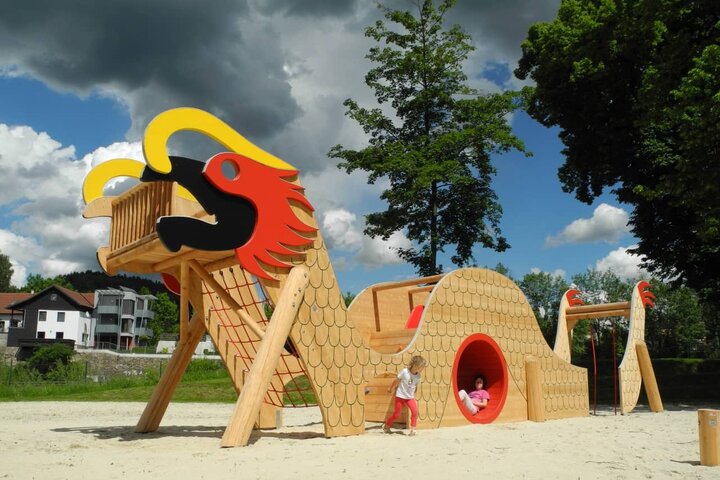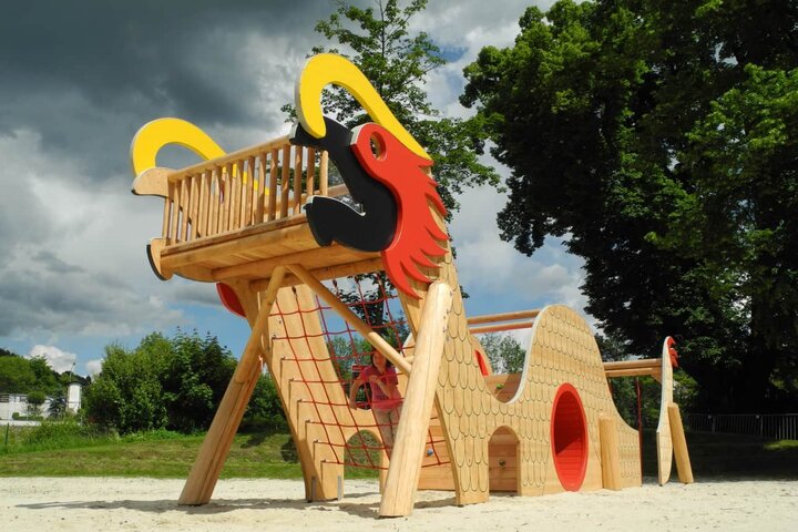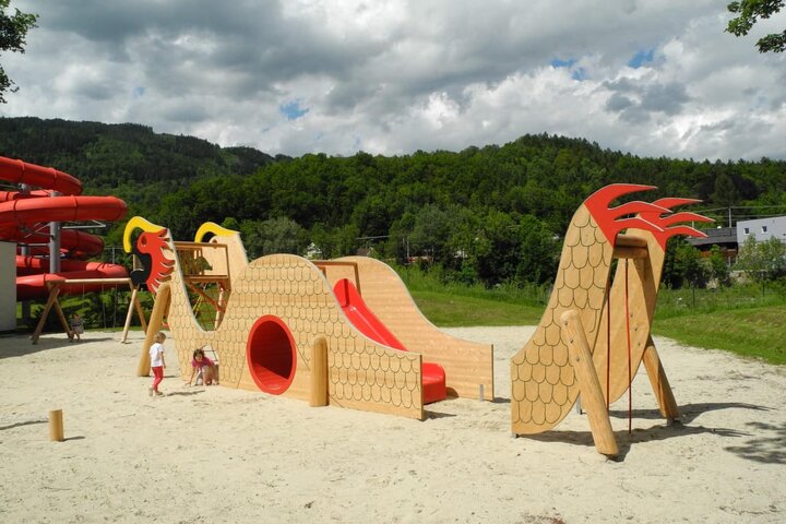Der Spieldrache sieht mit seinen 12 Metern Länge und mehr als 3,5 Metern Höhe nicht nur sehr beeindruckend aus, sondern bietet ausreichend Platz und Gelegenheit zum Klettern, Rutschen, Verstecken, Schaukeln etc. Dieses Spielgerät wurde vom Sunkid-Partner Almholz speziell für die Thematisierung des Asia Spa in Leoben entworfen und entspricht natürlich der Spielplatznorm EN 1176. Rund um den Drachen befinden sich weitere Spielgeräte aus Holz, die zum gewählten Thema passen.