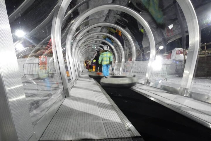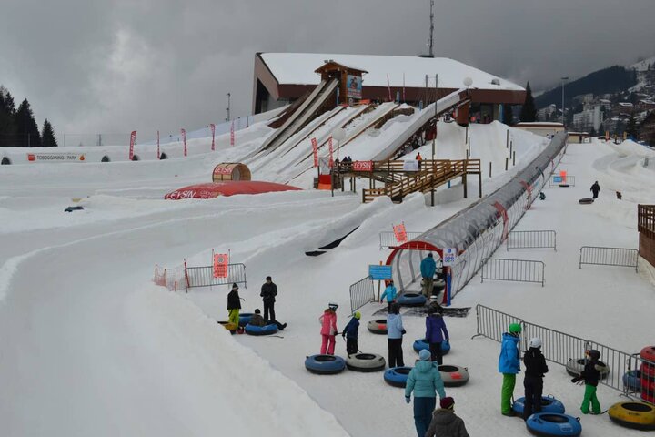 Der Tobogganing Park in der Nähe von Montreux (Genfersee) zählt zu den spektakulärsten Tubinganlagen weltweit. In dieser riesigen Anlage erbaut der Schweizer Olympiamedaillengewinner und Weltmeister im Bobfahren Silvio Giobellina jedes Jahr bis zu 11 neue Snowtubingbahnen mit einer Länge von bis zu 300 Metern. Der Start der Pisten befindet sich auf einem 5 Meter hohen Turm, von dem sich die beherzten Wintersportler hinunterstürzen und Geschwindigkeiten bis zu 60 km/h erreichen können.