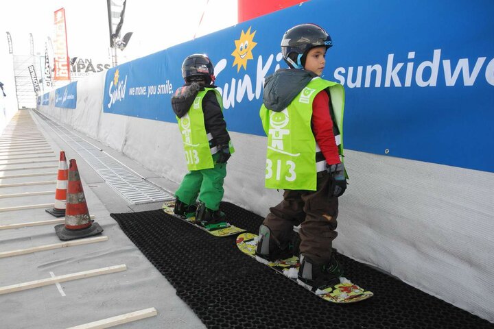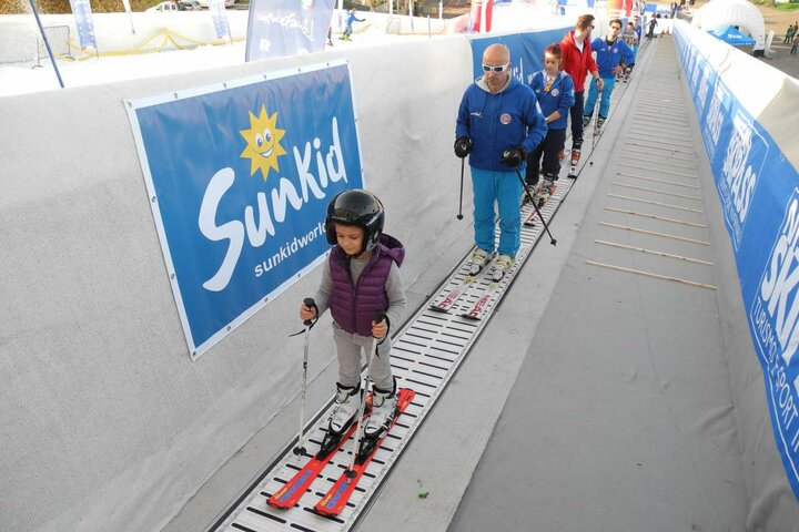 Modena/Italien: Der Sunkid Zauberteppich ermöglicht zahlreichen Besuchern der Wintersportmesse Skipass Modena erste Versuche auf dem Schnee
