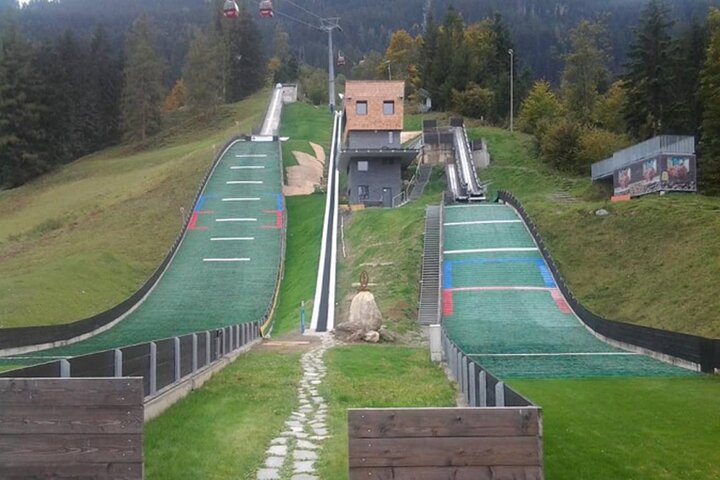 Ein 123 Meter langer Zauberteppich mit einer durchschnittlichen Steigung von sportlichen 34%(!) bringt die Skispringer zum Absprung