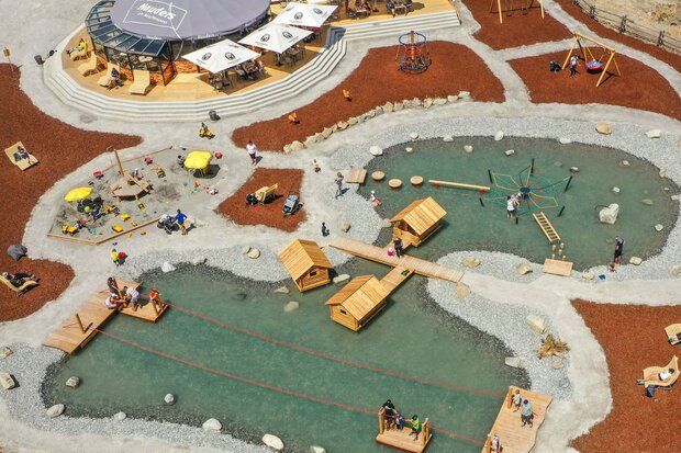 Das Element Wasser stellt nicht zufällig den Mittelpunkt des Spielplatzes dar, denn Kinder fasziniert nichts mehr als Wasser und alles, was sich damit „anstellen“ lässt. Zu den Highlights des Natur-Erlebnis-Geländes gehören unter anderem die Wasserspielewelt mit der Doppelfloßanlage, den Spielhütten im Goldteich, den Stauanlagen, der Riesensandkiste, Rutschen, Trampoline, Kletterseile uvm ...