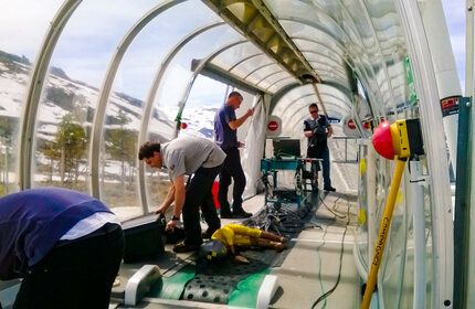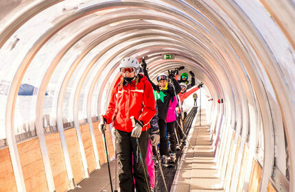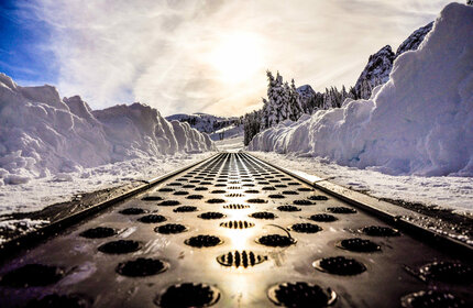 Sunkid entwickelt das erste moderne Personenförderband, das gänzlich ohne Fundamente direkt in den Schnee gelegt wird und auf einer speziellen Kunststoffgliederkette Personen transportiert.